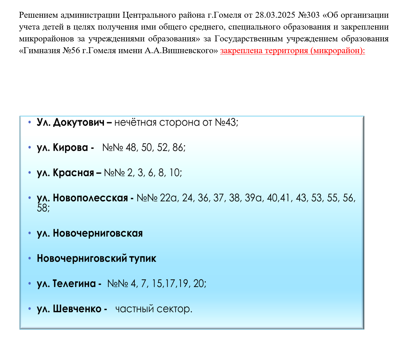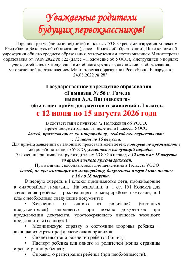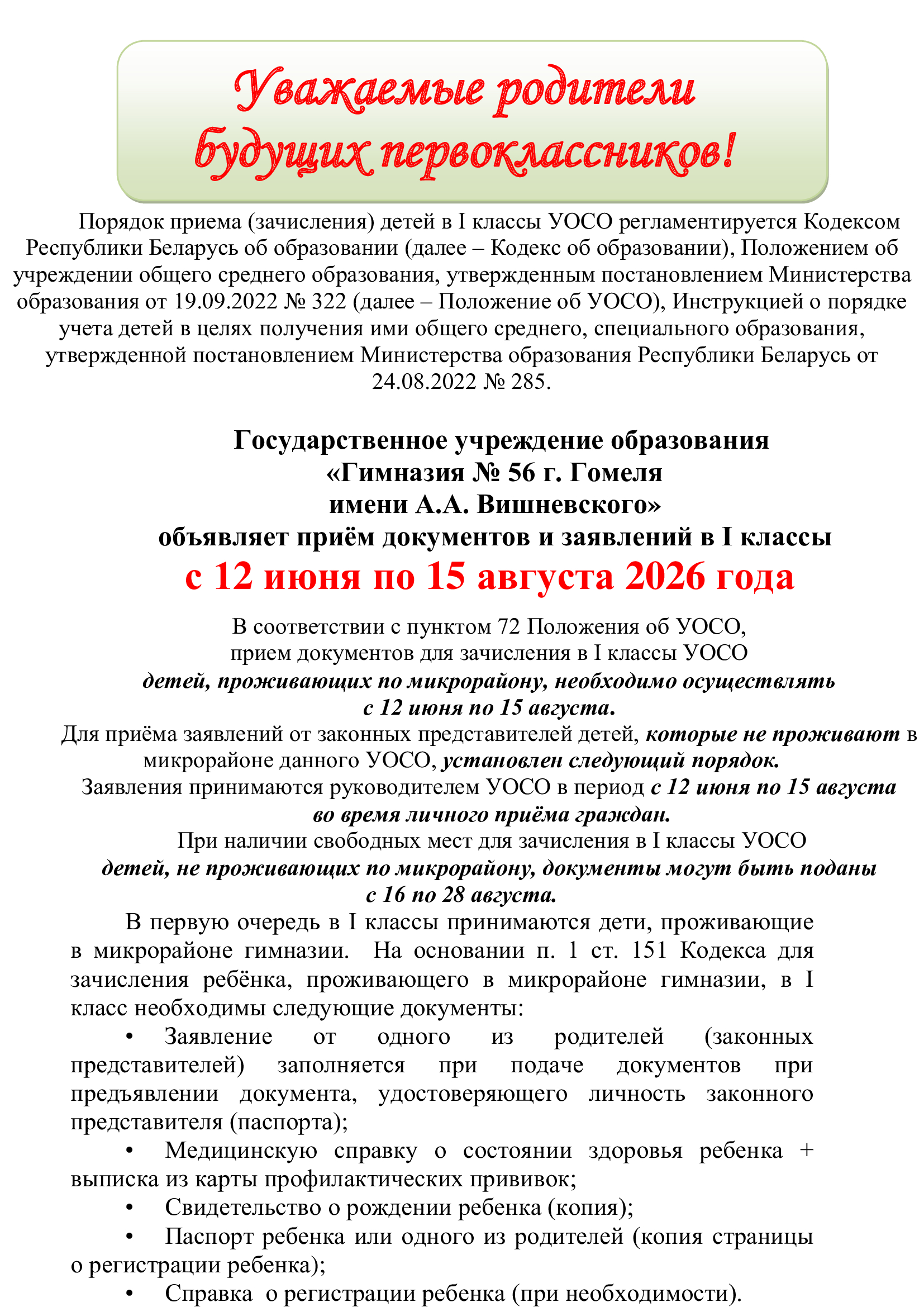 Государственного учреждения образования «Гимназия № 56 г. Гомеля имени А.А.Вишневского» на 2026/2027 учебный год: